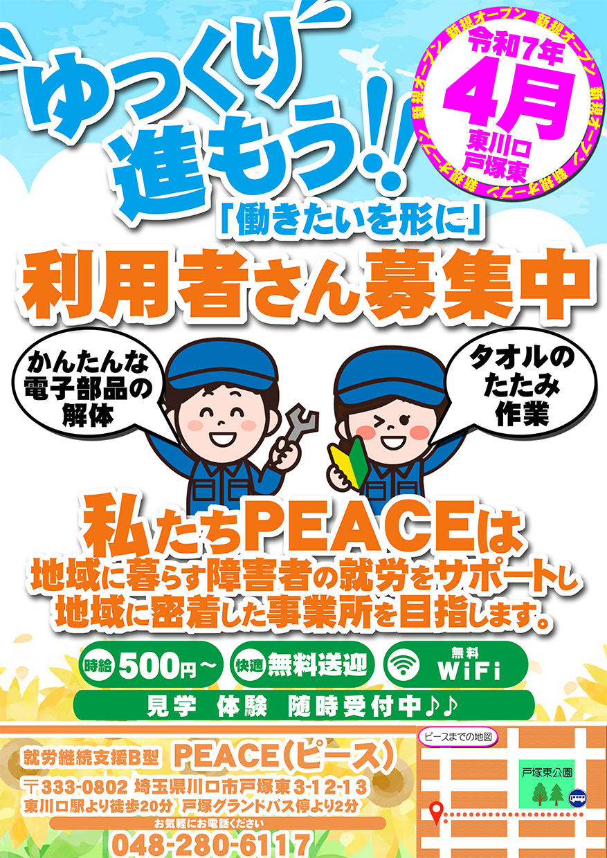 「就労継続支援B型事業所 PEACE」では、利用者様を募集中です。未経験の方、車いすご利用の方大歓迎です。皆様の自立した日常・社会生活を、スタッフ一同サポートいたします。